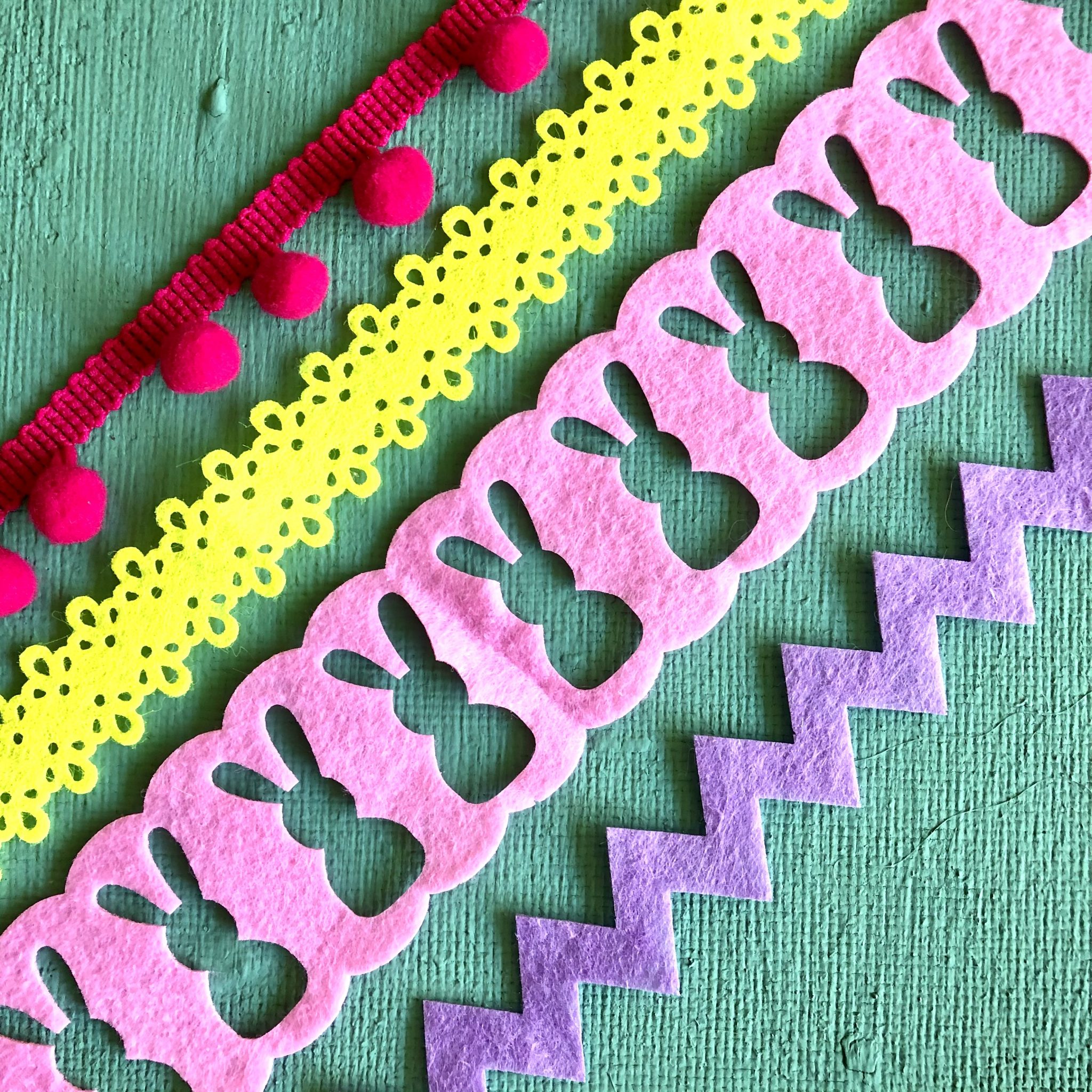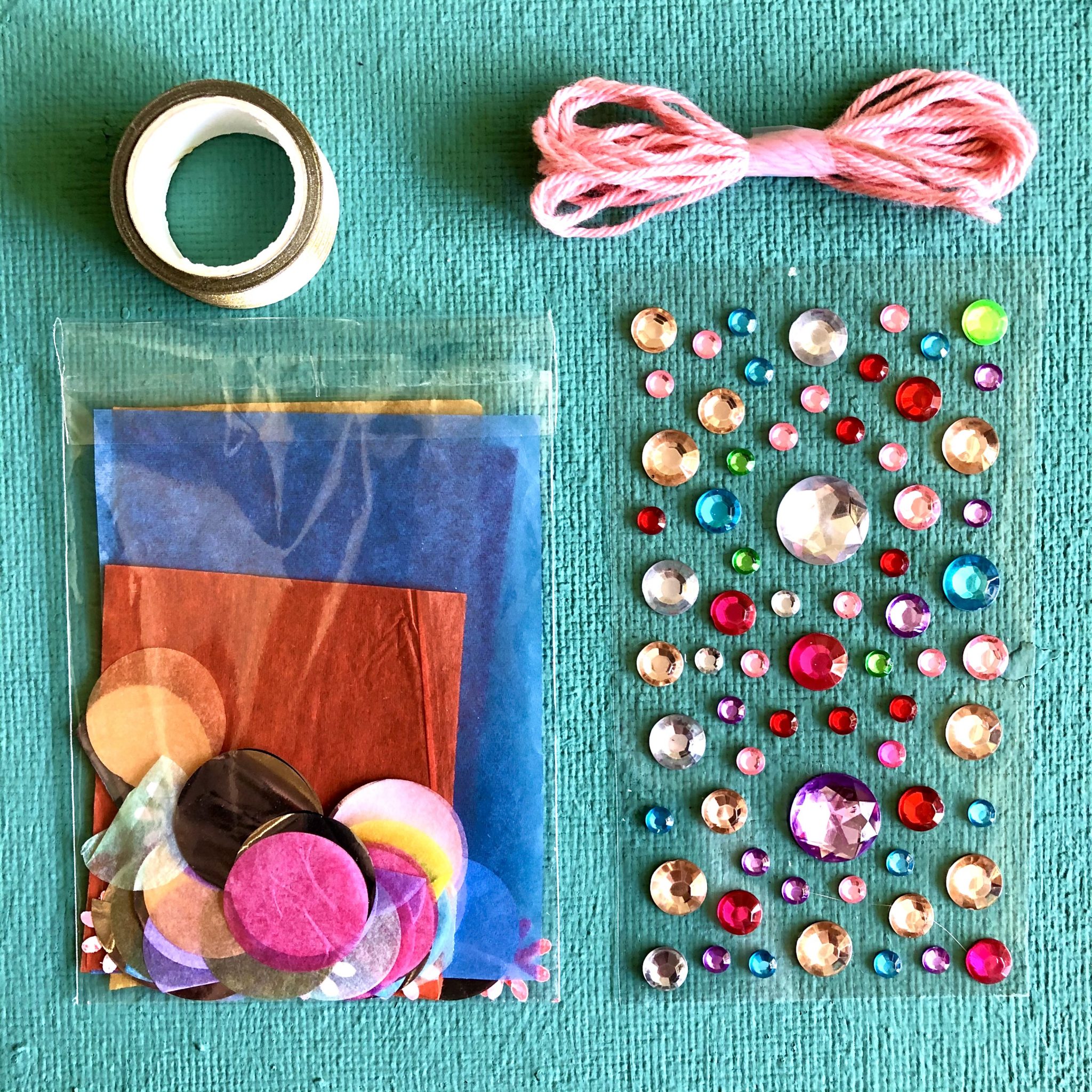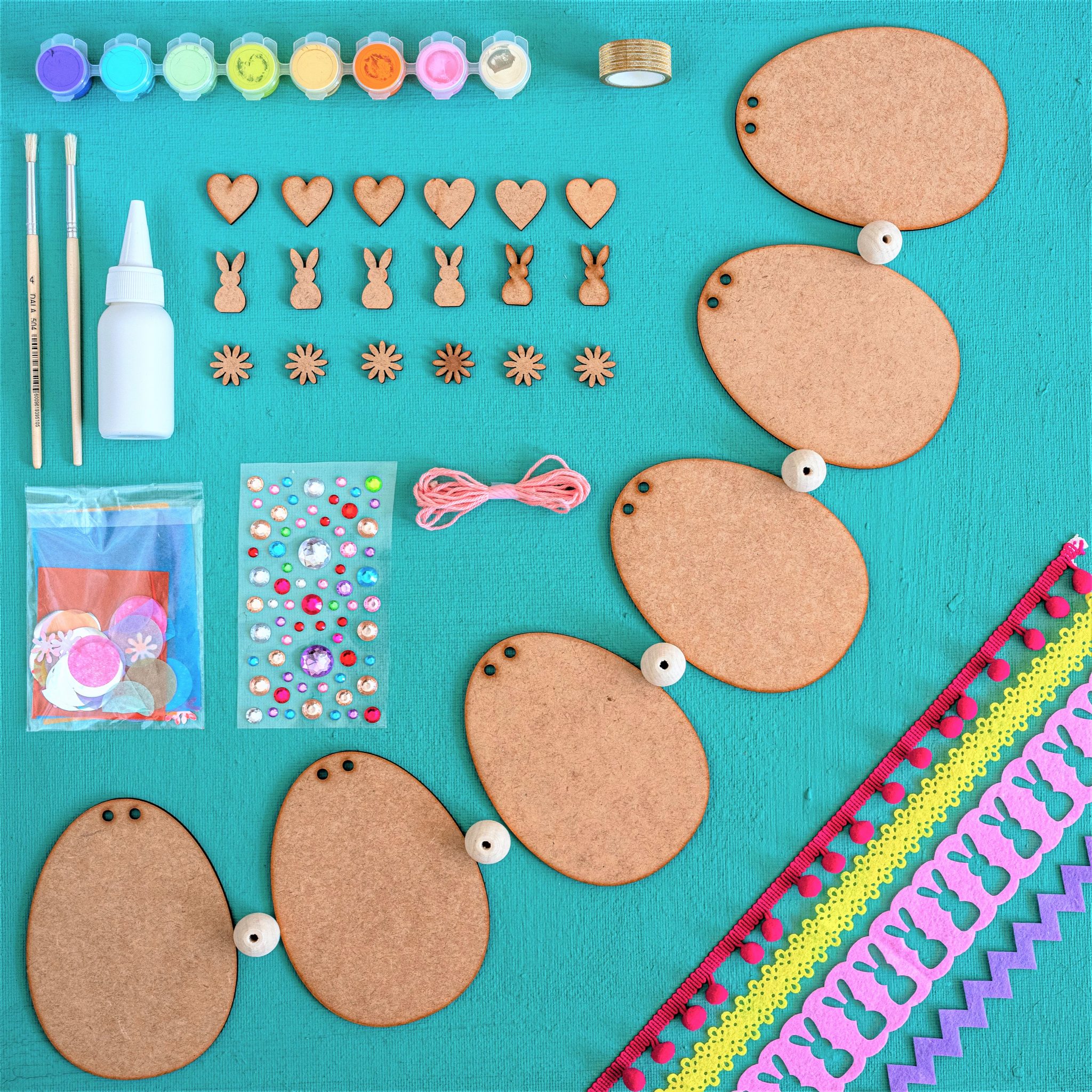 The box is brimming with assorted collage materials to decorate and adorn six easter eggs. String them together with wooden beads (paint those, too!) to create a unique Easter bunting. Perfect for siblings to share.