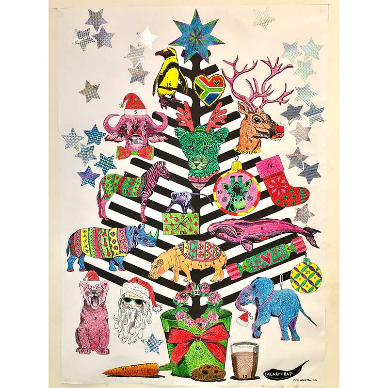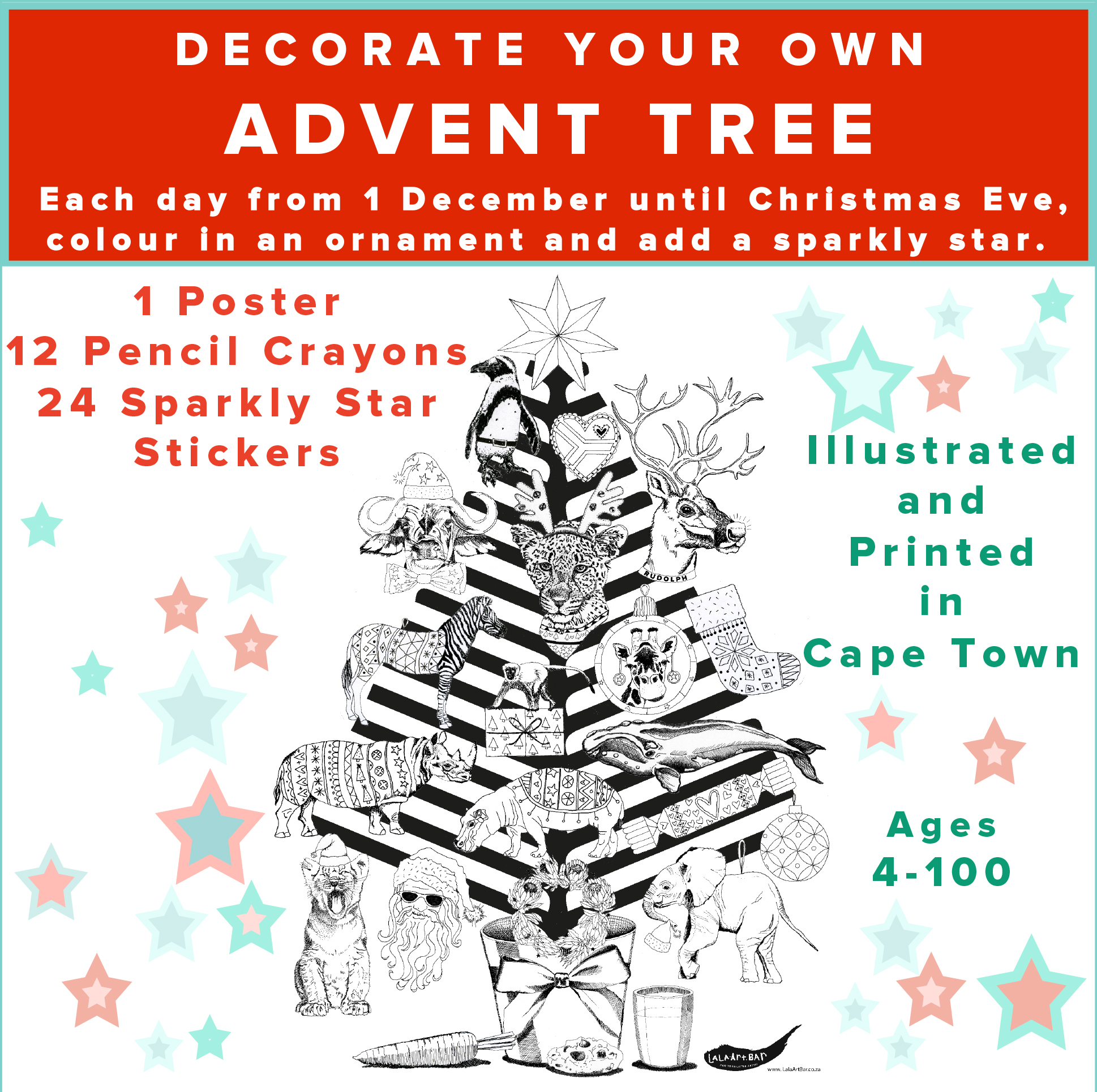 It also celebrates the build-up to an African Christmas. Father Christmas and Rudolph simply had to be included for Little Artists. However, there are no hedgehogs, robins, polar bears, foxes, or acorn-toting squirrels. Instead, you’ll find the big five in festive regalia, as well as a southern right whale, an African penguin, and a glamorous giraffe amongst the 24 items to colour in. There are no snowflakes, snowmen, or mittens: it’s summer in South Africa! Instead, paste spectacularly sparkly star stickers (one for each day) and think about the beautiful starry nights we enjoy in our Southern hemisphere summer.