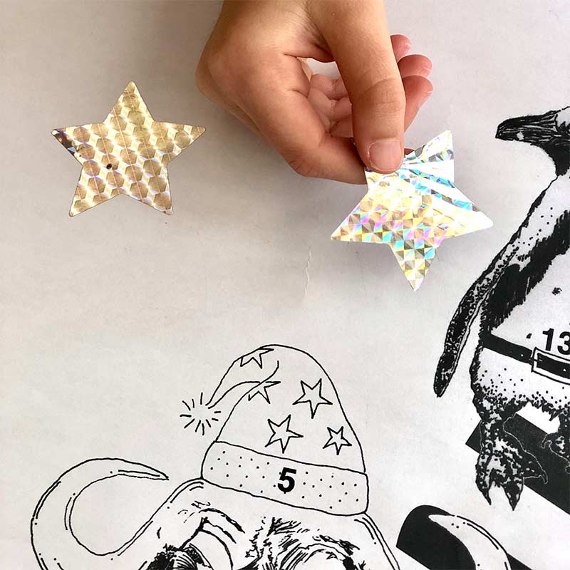 Each day from 1 December until Christmas Eve, colour in an ornament and add a sparkly star sticker.