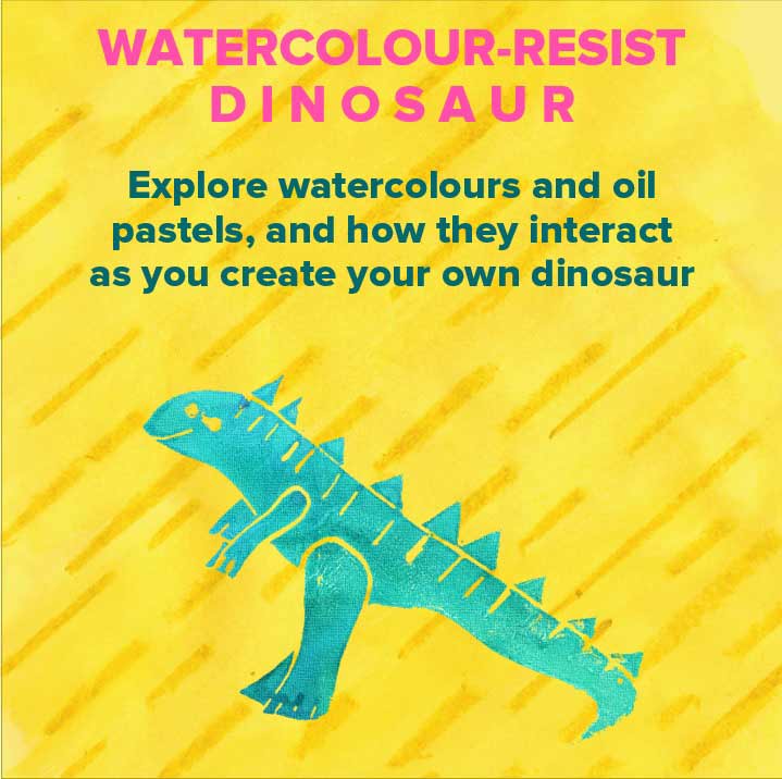 Explore watercolours and oil pastels as you create your own dinosaur friend.
